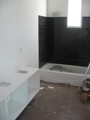 Builder Dad and I installed the counter top in the kitchen, cut a hole in it, and placed the cook top in. We also put a few cabinet shelves in and a couple of doors on. We started on the first bathroom by bolting the three cabinets on the wall. Tomorrow we still need to put the counter top on, drill some more holes in the top, and place the sinks on it. I think we'll need to put some more brackets underneath the sink cabinets (as they are just hung on the wall- they have no feet). We may also have to drill into the sink cabinets some more. For some reason, the Ikea sinks don't fit in them without them being a couple of inches away from the back wall... and they're not... so we'll be using the jig saw some more tomorrow!